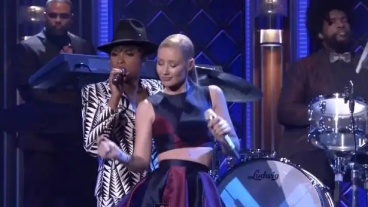 Iggy Azalea continua promovendo o álbum "Reclassified" nos Estados Unidos, se apresentando na noite de ontem (4) no programa de Jimmy Fallon ao lado de Jennifer Hudson.