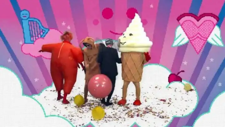 A banda também entrou na brincadeira e aparece fantasiada como alguns dos personagens do game fictício - o vocalista Damon Albarn é o cone de sorvete, a imagem que a banda vem usando em toda sua produção gráfica atual.