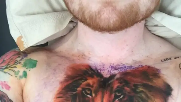 O cantor, famoso por ter os dois braços fechados de desenhos coloridos, arriscou a imagem de um leão em seu peito. "Ainda na metade, e que dor", escreveu o britânico em sua página do Instagram.