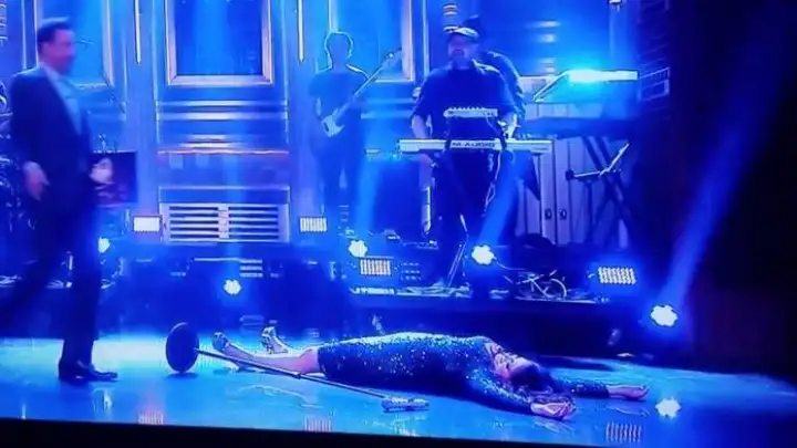 Fallon correu para socorrer a cantora que levou o tombo na esportiva como pode ser visto no vídeo abaixo.